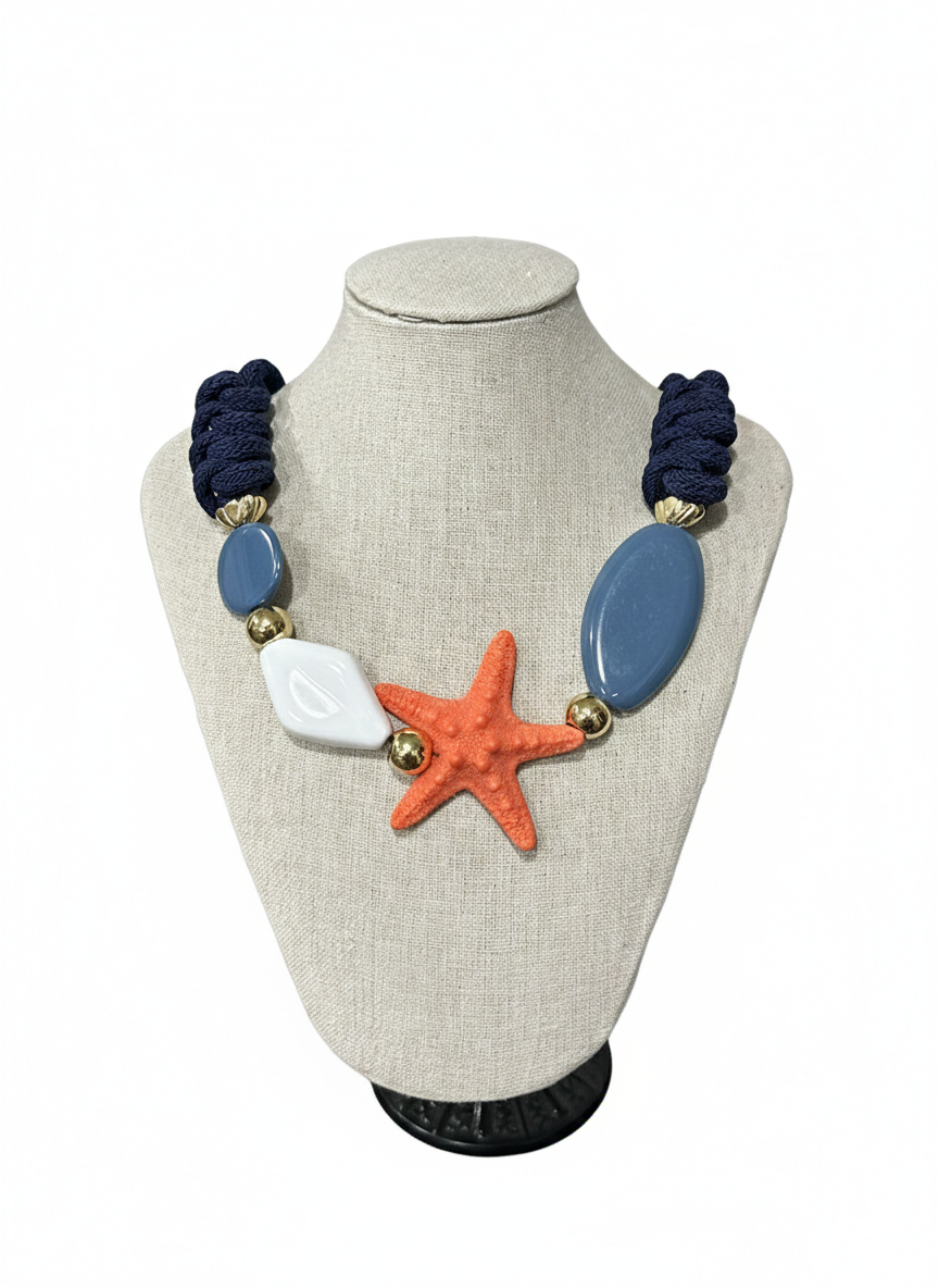 Collar cordon con cordon estrella de mar y piezas de resina. Largo: 50 cm.