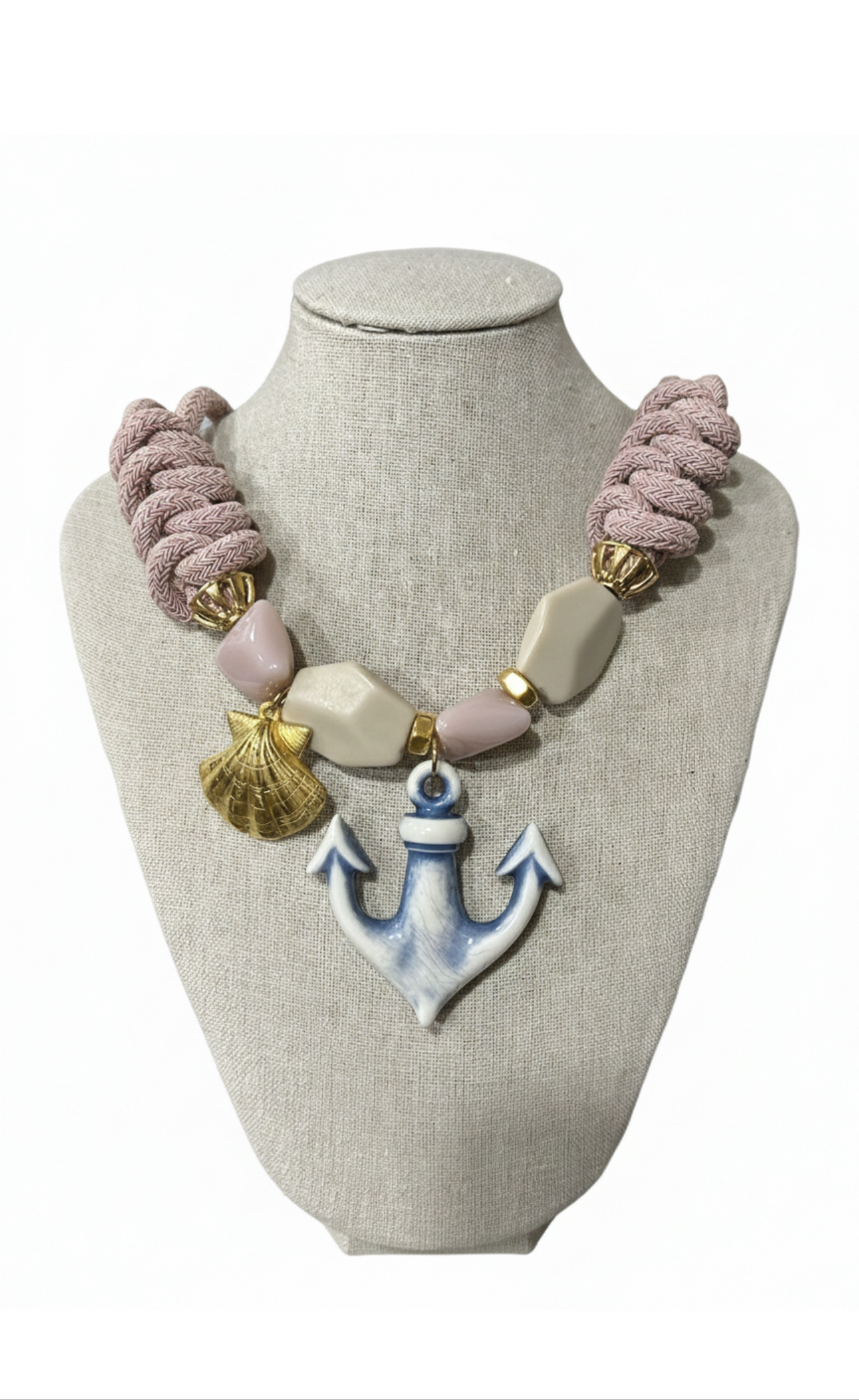 Collar cordon rosa empolvado con resinas en tonos pastel y ancla de resina y concha metalica dorada. Largo: 50 cm