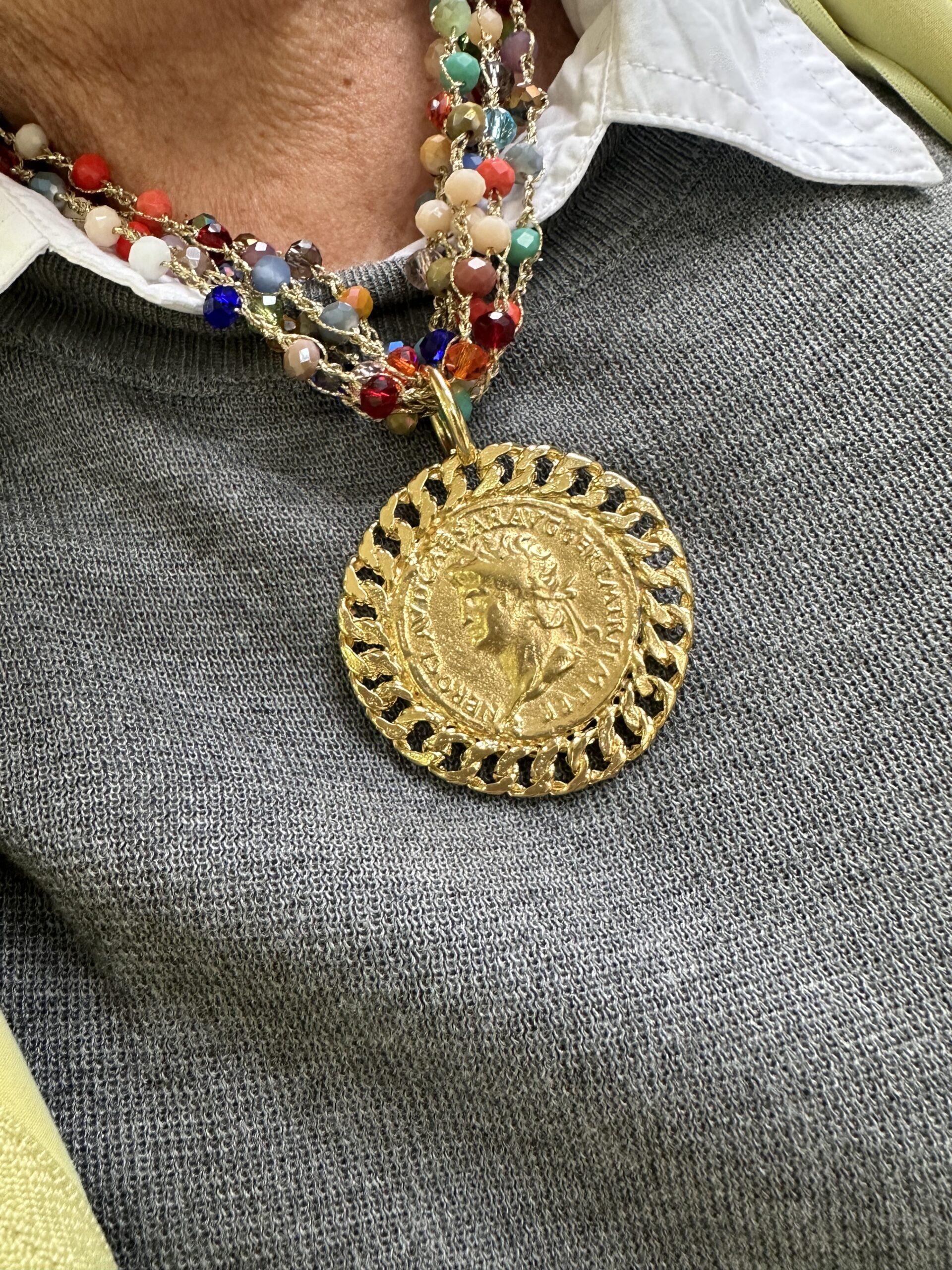 Collar de 6 vueltas con cristales e hilo metalizado dorado con cierre marinero de acero dorado, con medalla metalica de 5 cm.