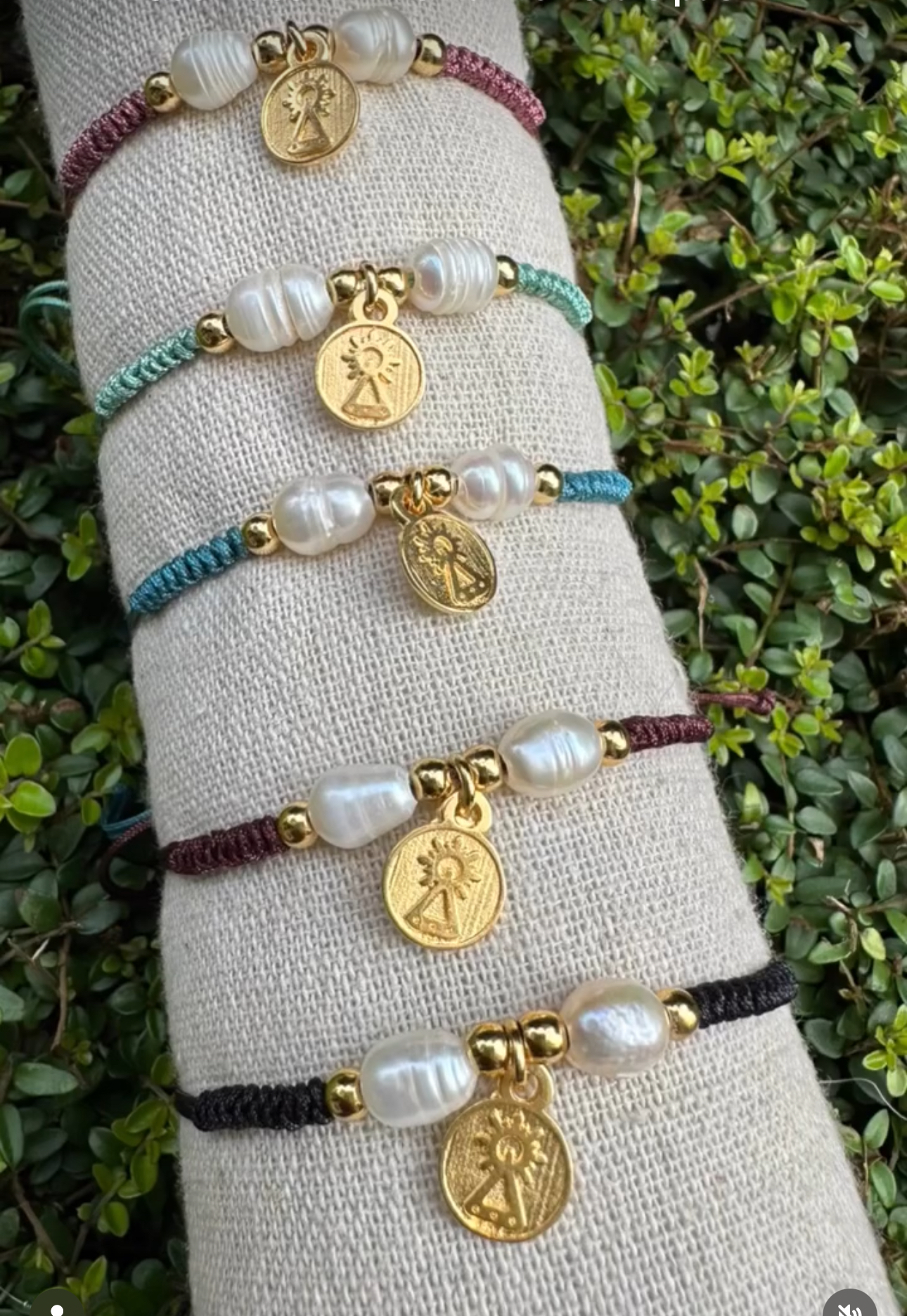 Pulsera virgen de covadonga con perlas naturales, trenzada con hilo. Medida: Cierre nudo macrame adaptable a cualquier medida.